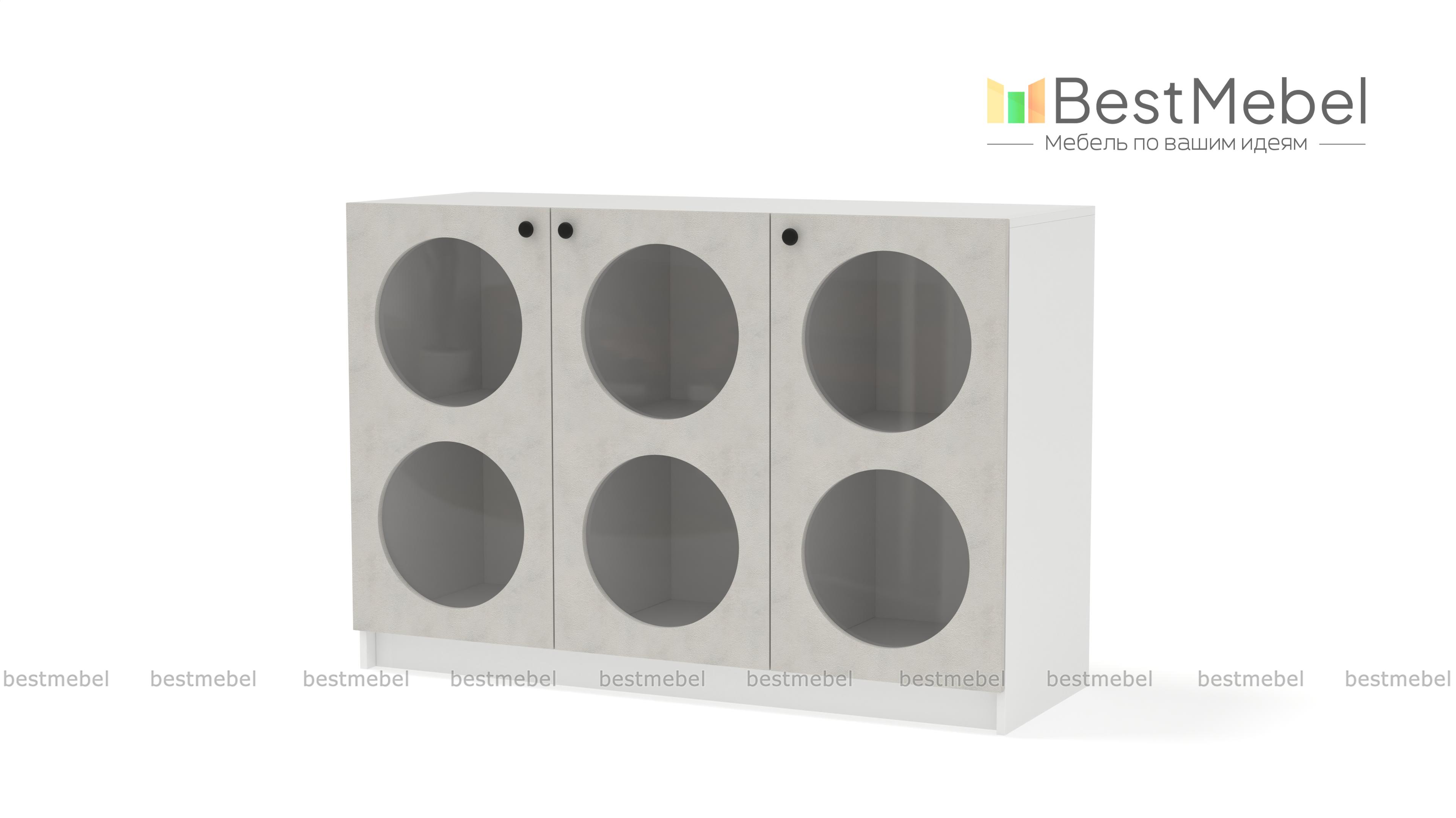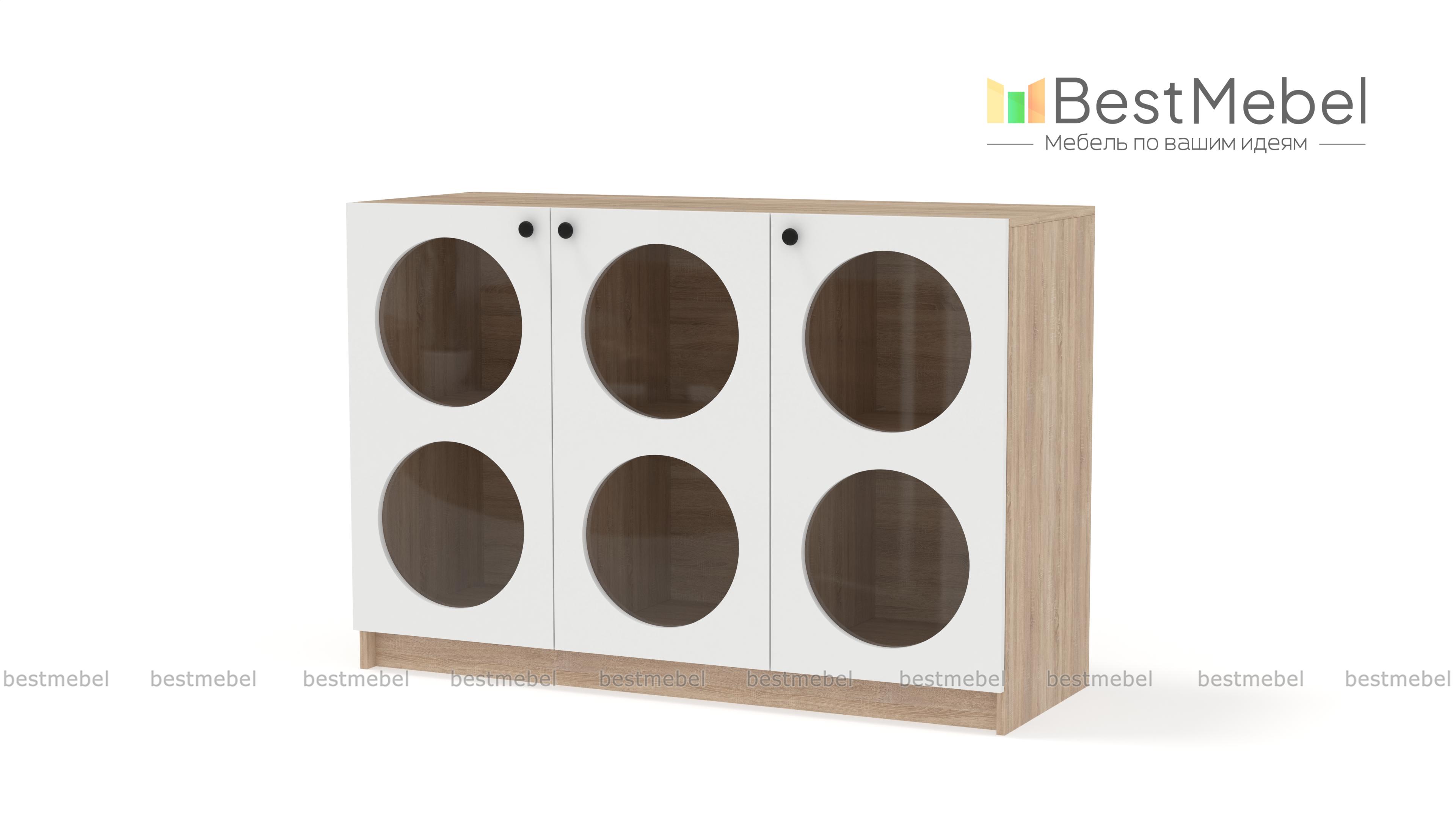 Комод Руди 1 BMS в современном дизайне внесет стильный акцент в интерьер гостиной, спальни или комнаты подростка. Три распашные дверцы имеют круглые вырезы со стеклом, за которым особенно эффектно смотрятся книги, посуда и любимый декор. Внутри комод разделен полками и перегородками на шесть секций, позволяя удобно расположить вещи по категориям. Купить комод Руди 1 BMS с выбором размеров, цвета и фурнитуры вы сможете недорого на сайте нашего интернет-магазина.