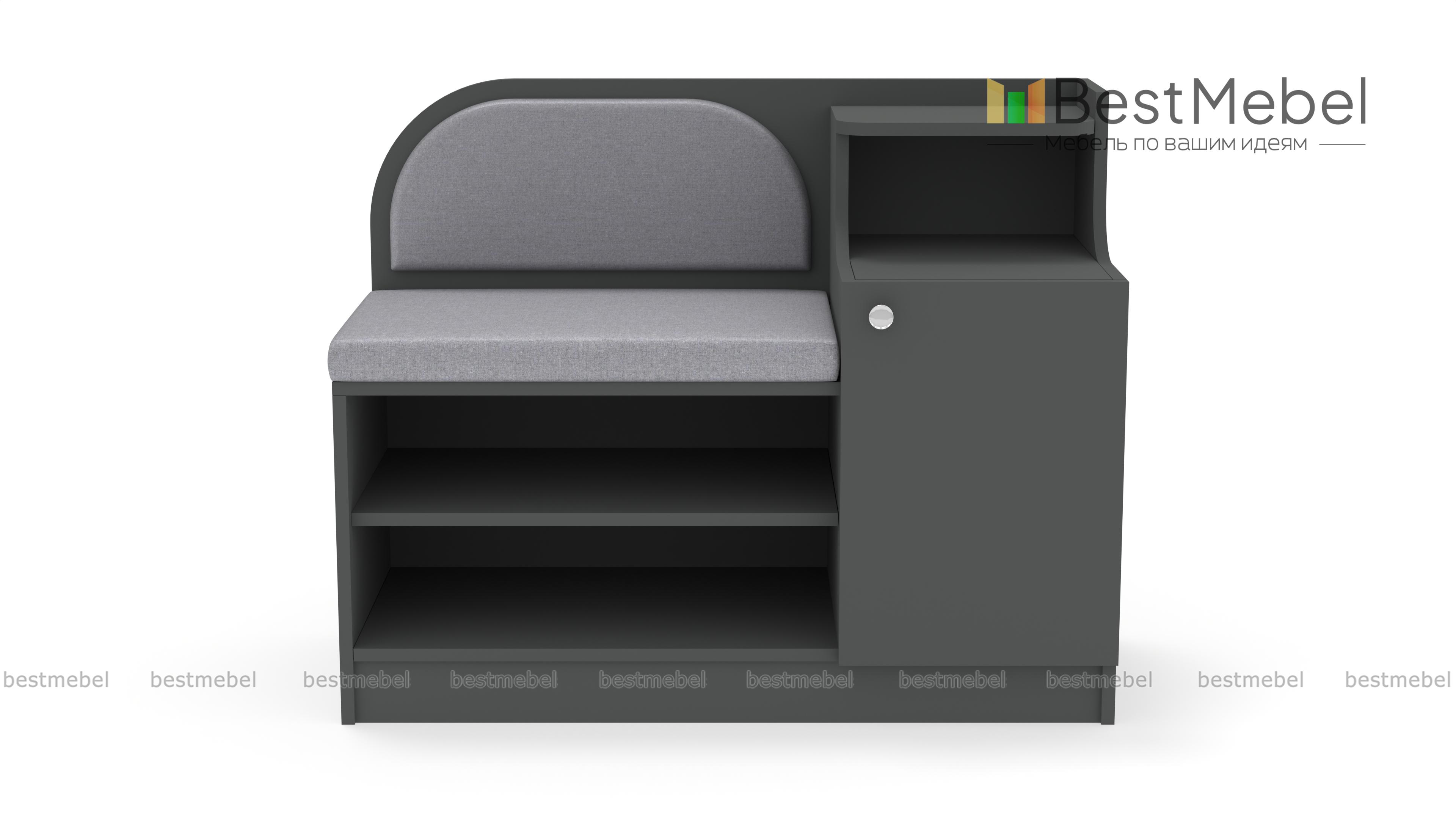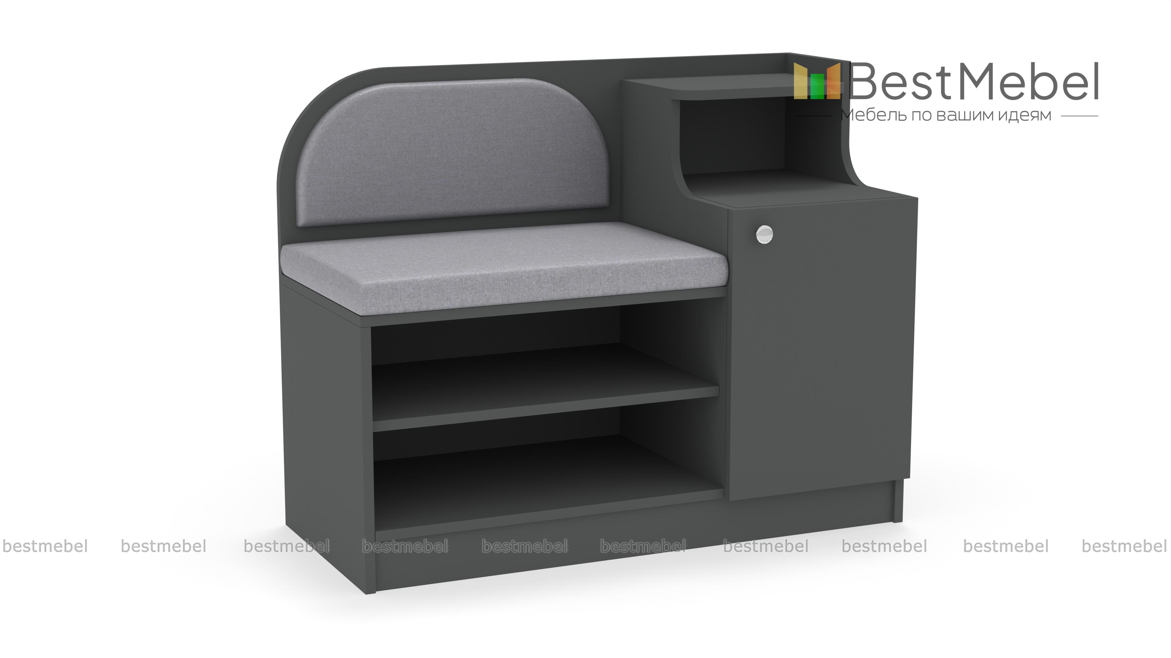 Обувница Меренга BMS поможет вам не только бережно разместить обувь, уходовые средства и бытовые мелочи, но и с комфортом обуться. Многофункциональная модель оборудована открытыми обувными полками, распашным отделением, нишей и сиденьем с высокой скругленной спинкой. Обувница выполнена в практичных темных тонах, на сиденье располагаются мягкие накладки в износостойкой ткани. Купить обувницу Меренга BMS и дополнить интерьер входной зоны практичным предметом вам поможет наш интернет-магазин.
