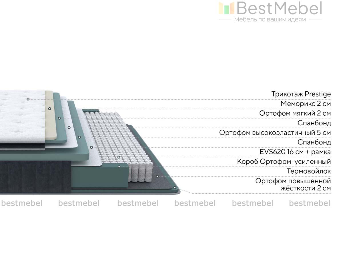 Состав: Меморикс 2см (Ортофом (ППУ) с эффектом памяти) \ Ортофом (ППУ) мягкий 2см \ Ортофом (ППУ) высокоэластичный 5 см \ Спанбонд \ EVS620 16см \ рамка к ПБ \ Термовойлок \ Ортофом (ППУ) повышенной жесткости 2см \ Короб усиленный (ВППУ).