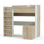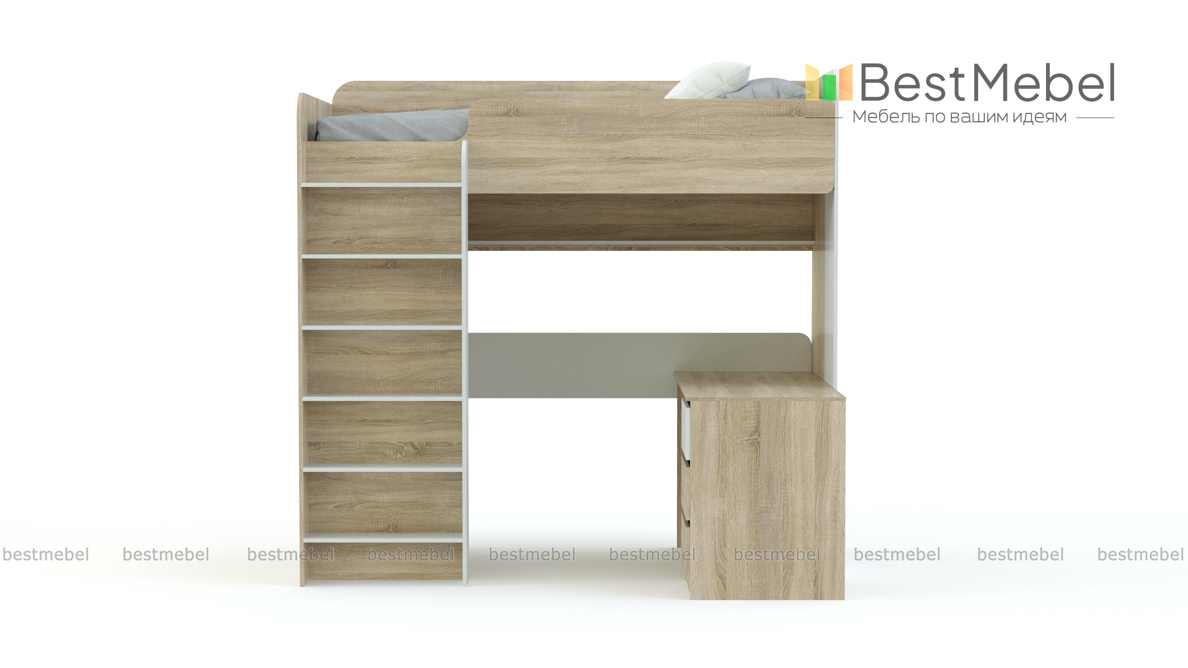 Детская кровать-чердак Дм110 BMS – практичная модель для небольшой по площади комнаты ребенка. Здесь удачно реализована учебная зона и спальное место. Оно находится наверху, в целях безопасности оборудовано бортами. Лестница устойчивая, прочно крепится к каркасу. Под основанием расположен стол. Он оснащен отделениями для хранения (выдвижные ящики). Габариты столешницы подойдут младшему школьнику. Учебники и книги расставьте на полке. Привлекательная конструкция сделана из ЛДСП. Цвет материала подбирается под стиль интерьера и вкусы владельца.