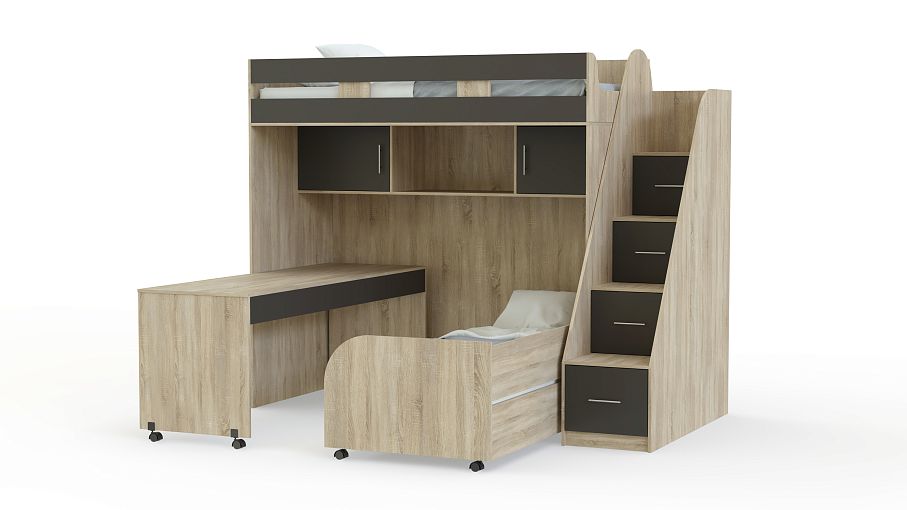 Детская кровать Минима КД-136 BMS представляет собой практичную модель-трансформер, особенно актуальную в небольших помещениях. На втором ярусе располагается спальное место с бортиками, добраться до которого поможет торцевая лестница с удобными ступенями, а в нише на первом скрыты книжные полки, выкатная кровать и письменный стол с колесными опорами. В сложенном виде композиция занимает минимум места и экономит полезную площадь для игр. Купить детскую кровать Минима КД-136 BMS приглашаем в наш интернет-магазин.