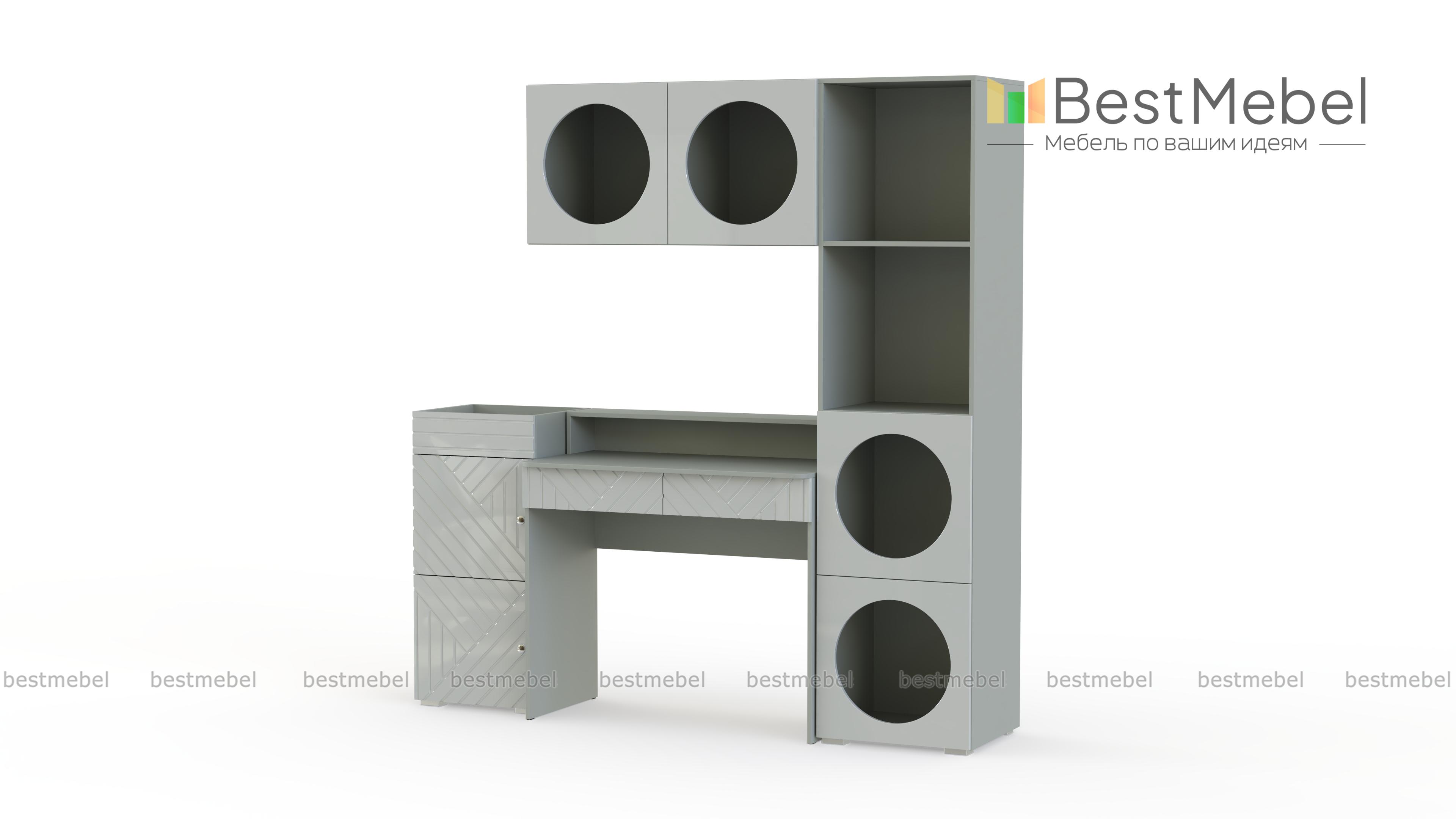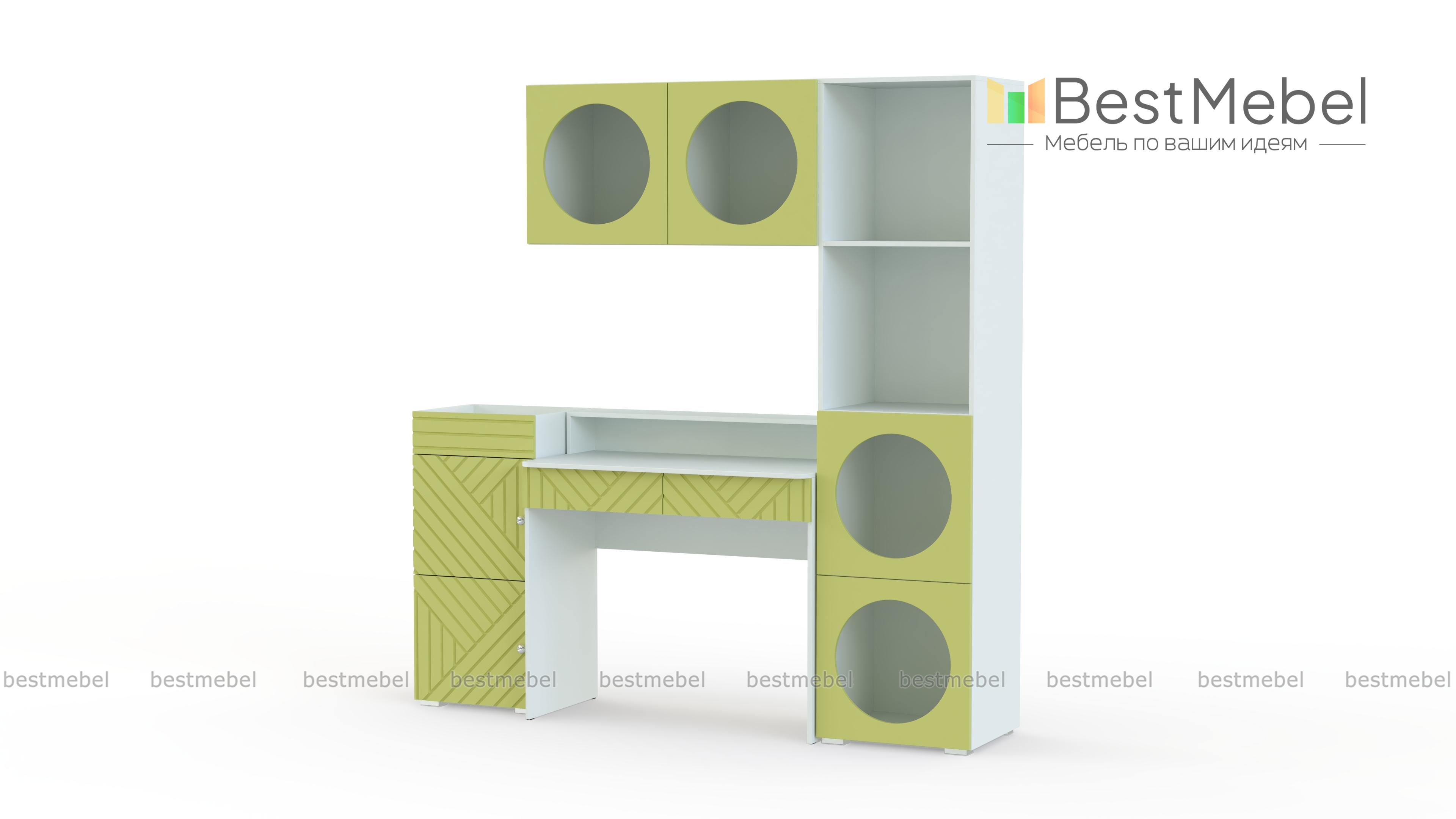 Детская стенка Авелин 9 BMS идеально подходит для небольших помещений. Готовая композиция включает в себя все необходимое для организации комфортного рабочего места: компьютерный стол с ящиками и надстройкой, высокую тумбу, стеллаж и подвесную полку. В отделке фасадов использована геометрическая фрезеровка, а круглые полки создают стильный дизайн с особым характером. Купить детскую стенку Авелин 9 BMS в оттенках нашего каталога вы сможете на сайте интернет-магазина.