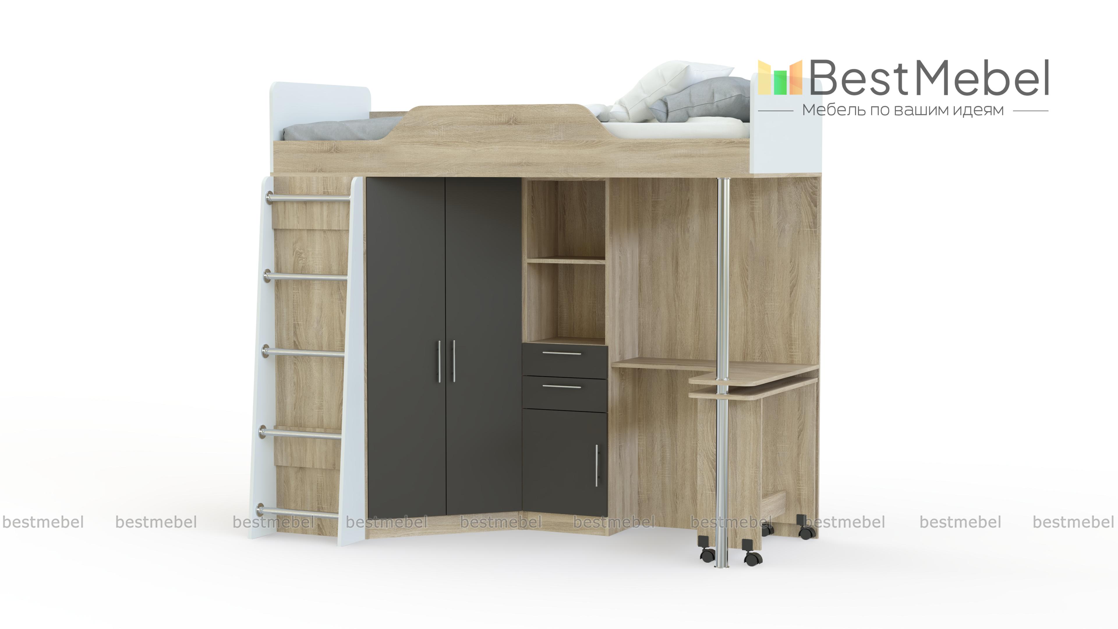 Кровать-чердак со столом Ника 427 BMS – многофункциональная модель, которая станет практичным решением для малогабаритного помещения. Конструкция включает в себя просторное спальное место, оснащенное защитным бортиком, удобную лестницу с хромированными перекладинами, распашной шкафчик с платяным отделением, комбинированный пенал для книг и принадлежностей для школы и творчества и угловой стол с выдвижной секцией. Купить кровать-чердак со столом Ника 427 BMS и оборудовать детскую всем необходимым для комфортного сна, учебы и хранения вещей ребенка, вы сможете с помощью нашего интернет-магазина.
