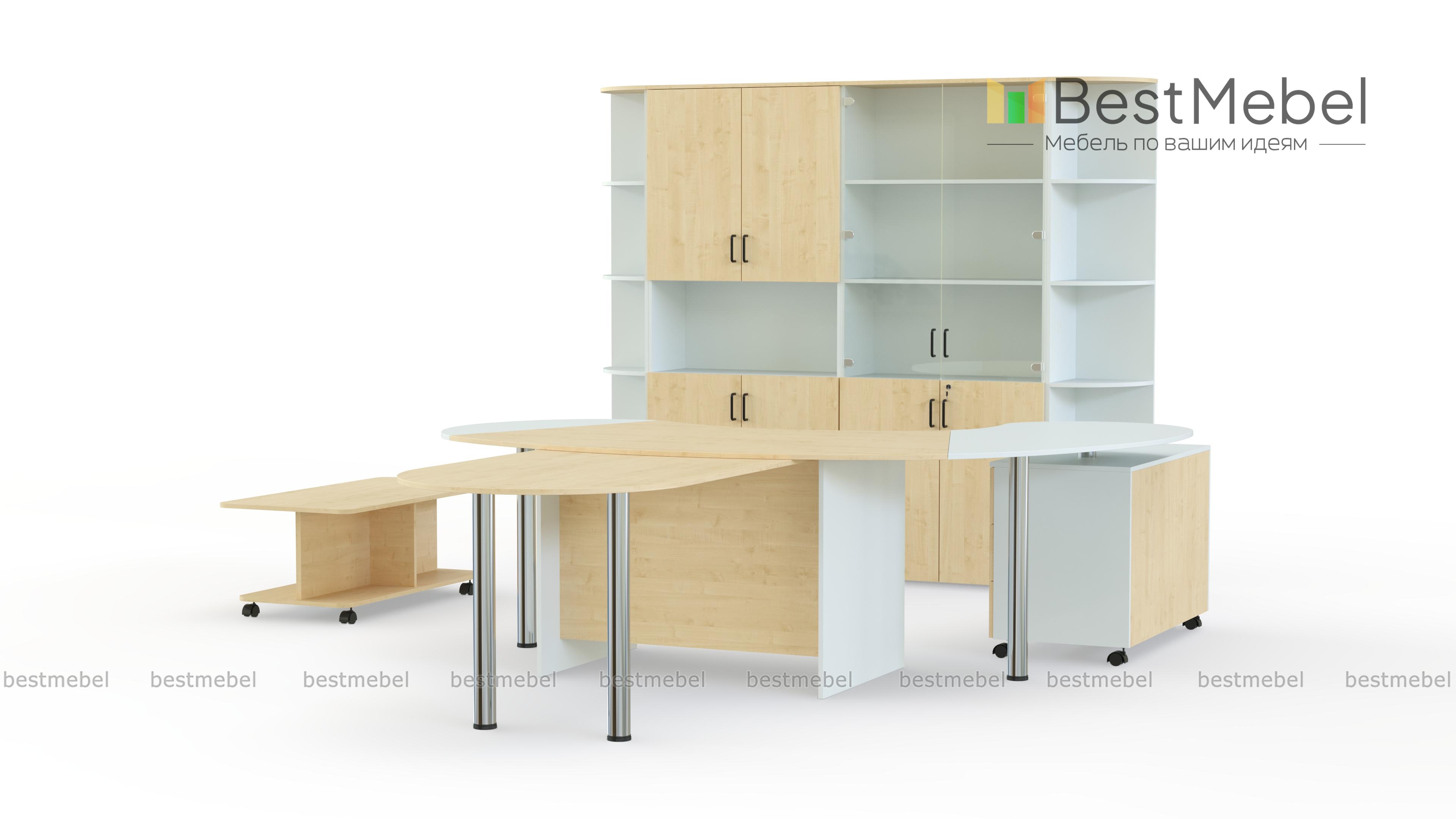 В комплект входит 2 шкафа, 2 угловые приставки, письменный стол, 2 приставных стола и журнальный столик. В кабинете будет комфортно работать, проводить небольшие совещание и принимать посетителей. Заказать комплект можно в двух цветах.