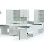 В комплект входит 5 шкафов, тумба, пенал и 4 стола с приставными конструкциями, две подвесные полки. Есть возможность компоновать между собой элементы по своему усмотрению, зависимо от площади кабинета и предприятия, где они будут использоваться.