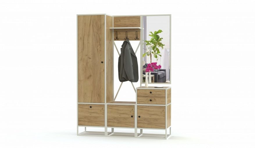 Прихожая Феникс 15 BMS, выполненная из износостойкой ЛДСП теплого крафтового оттенка и металла, станет частью уютного лофта. Удобная система хранения включает в себя все необходимое для размещения одежды, обуви, аксессуаров и уходовых средств. Модульная композиция включает в себя пенал, открытую вешалку с обувницей и тумбу с выдвижными ящиками и распашным отделением, дополненную навесным зеркалом. Купить прихожую Феникс 15 BMS и оборудовать комфортную входную зону вам поможет наш интернет-магазин.
