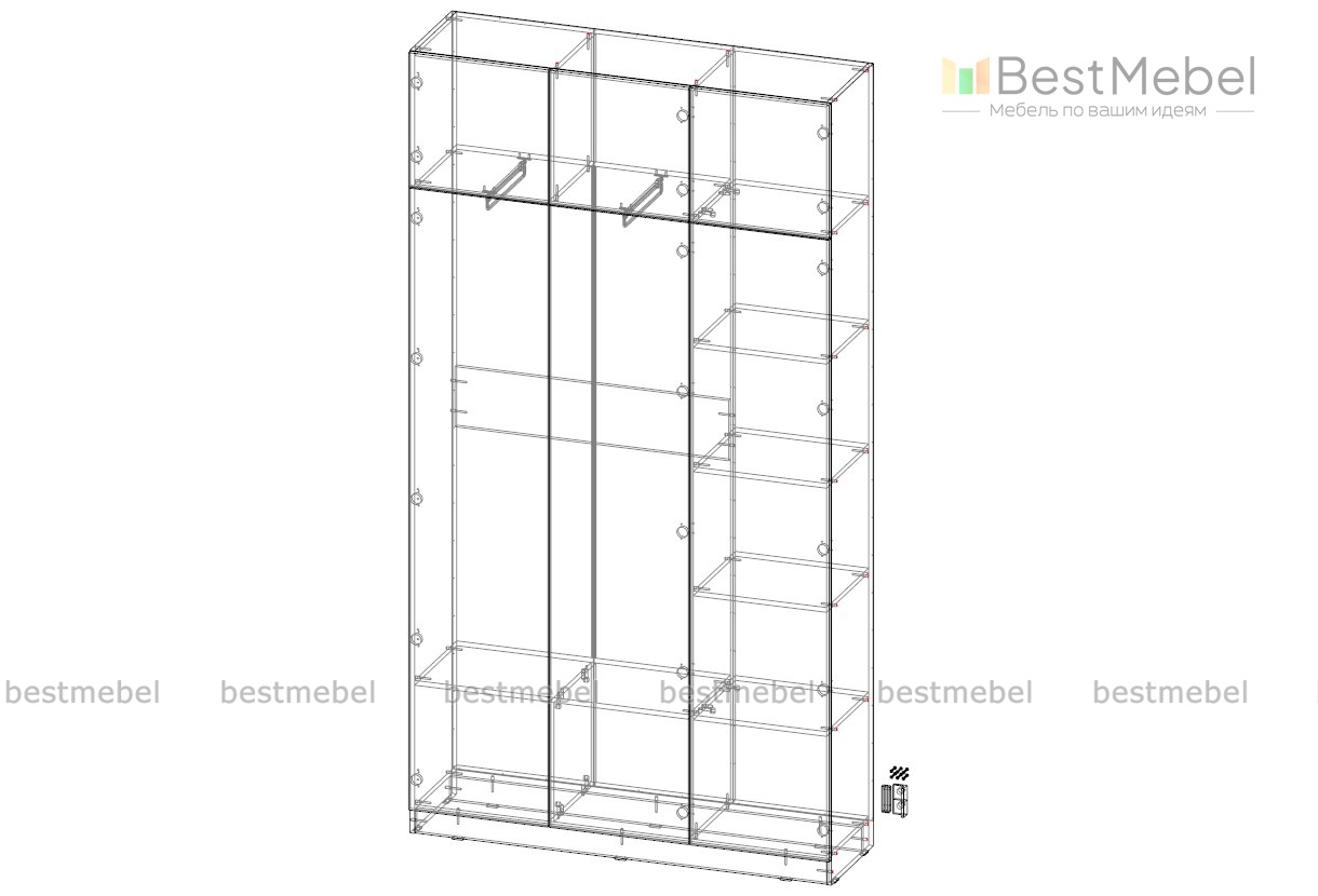 Современный дизайн и стильная фурнитура придают шкафу изысканный вид, делая его не только функциональной, но и декоративной частью интерьера.Шкаф оснащен просторными полками, двумя выдвижными штангами для вешалок, что обеспечивает удобную организацию пространства и позволяет легко поддерживать порядок. Шкаф без ручек, их можно приобрести отдельно в нашем интернет магазине.