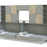 Шкаф-кровать трансформер Энни BMS – это многофункциональная линейная композиция, которая станет практичным решением для комнаты двоих детей. Стенка современного дизайна оборудована удобной системой хранения, включающей в себя распашные отделения, открытые полки и нишу под ТВ, а в нижней части располагаются модули с откидными кроватями. Благодаря горизонтальному механизму раскладывания модель оптимальна для узких помещений, значительно экономя пространство. Купить шкаф-кровать трансформер Энни BMS, выполненный в спокойной бело-зеленой гамме, приглашаем в наш интернет-магазин.