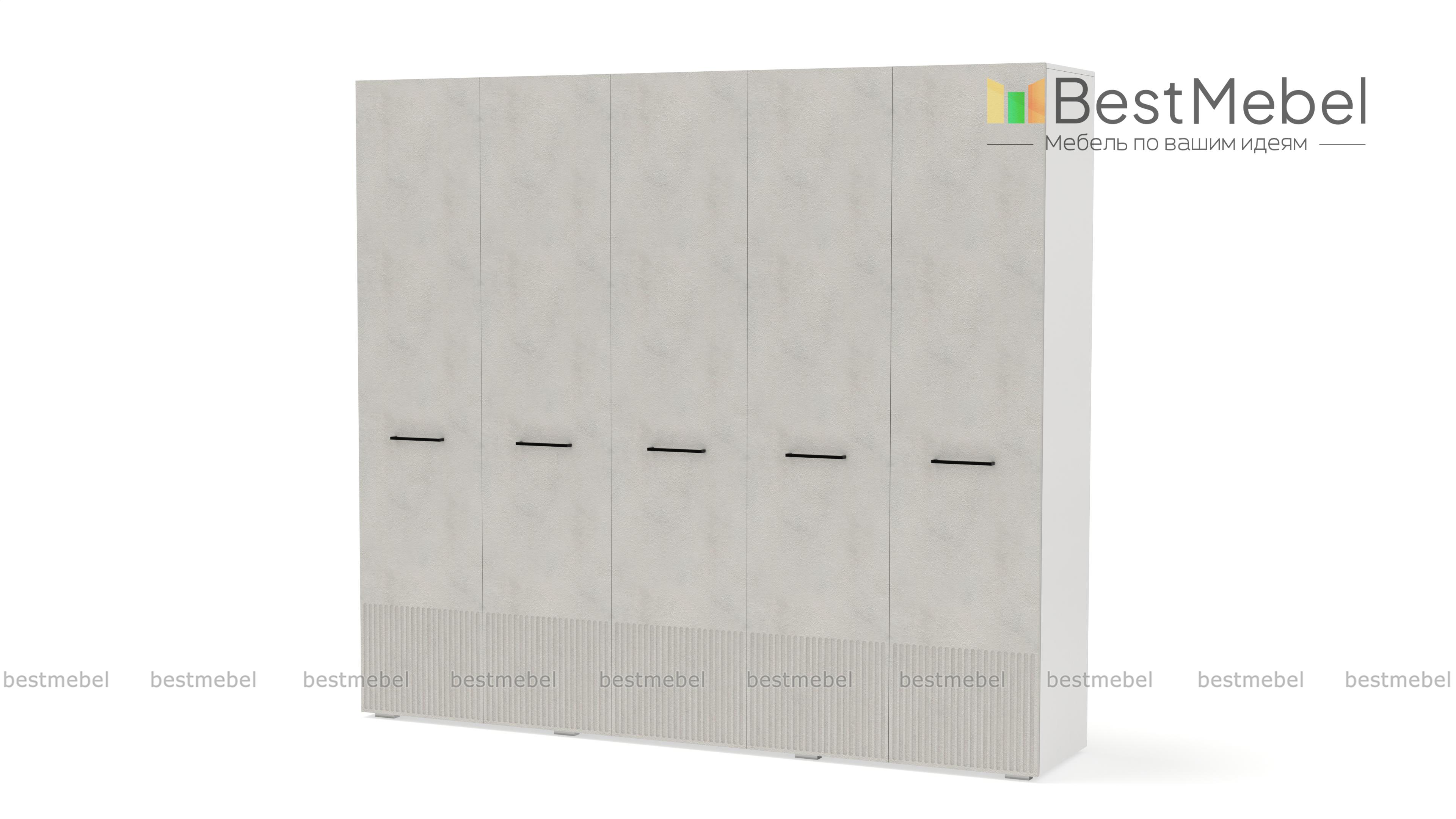 Шкаф распашной Декарт 5 BMS сочетает простую традиционную форму и актуальный дизайн. На сплошном светлом фасаде из МДФ выделяются поперечные ручки-скобы и фрезерованный рельеф, создавая визуально легкую конструкцию. Пятидверный гардероб позволяет организовать хранение с помощью пары штанг, вместительных верхних и бельевых полок. Купить шкаф распашной Декарт 5 BMS в удобном размере и любых оттенках из каталога вы сможете на сайте нашего интернет-магазина.