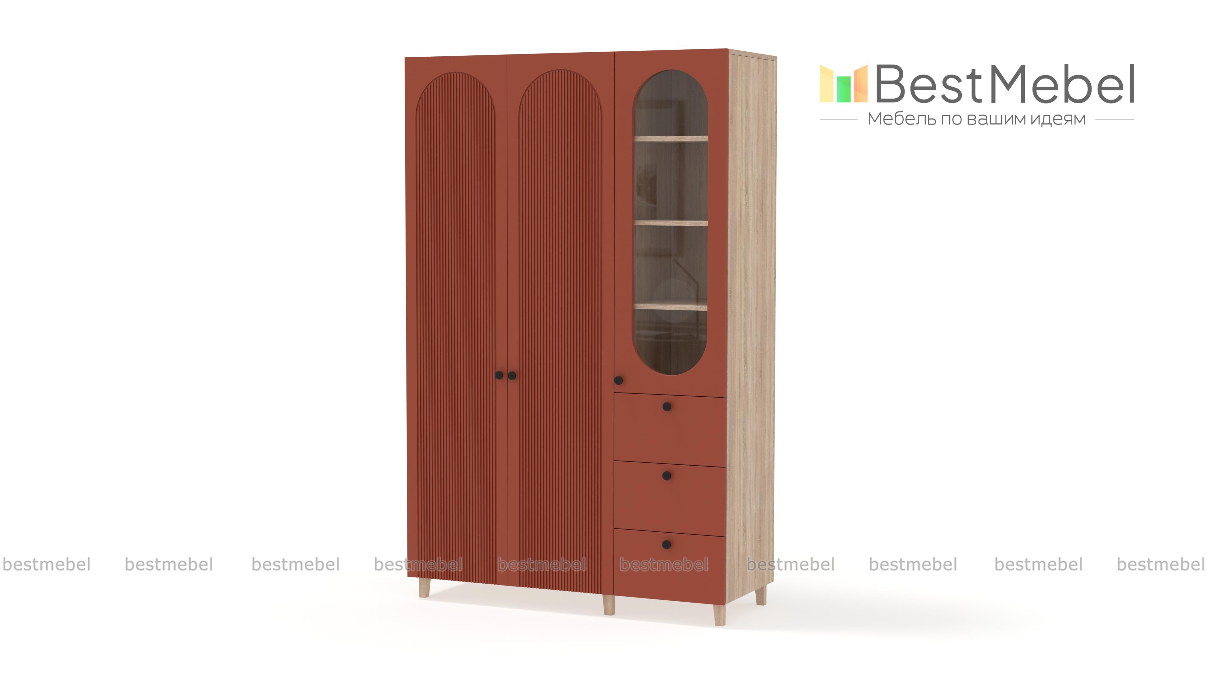 Шкаф распашной Рене 13 BMS объединил для хранения платяное отделение с двумя дверцами и витрину, комбинированную с тремя выдвижными ящиками. Одежда на вешалках, трикотаж, органайзеры с мелочами, книги и декор размещаются компактно и эстетично. Сочетание темных и природных древесных оттенков с декоративными вырезами и фрезеровкой — стильное современное решение. Купить шкаф распашной Рене 13 BMS вы всегда сможете в нашем интернет-магазине с изготовлением по индивидуальным размерам.