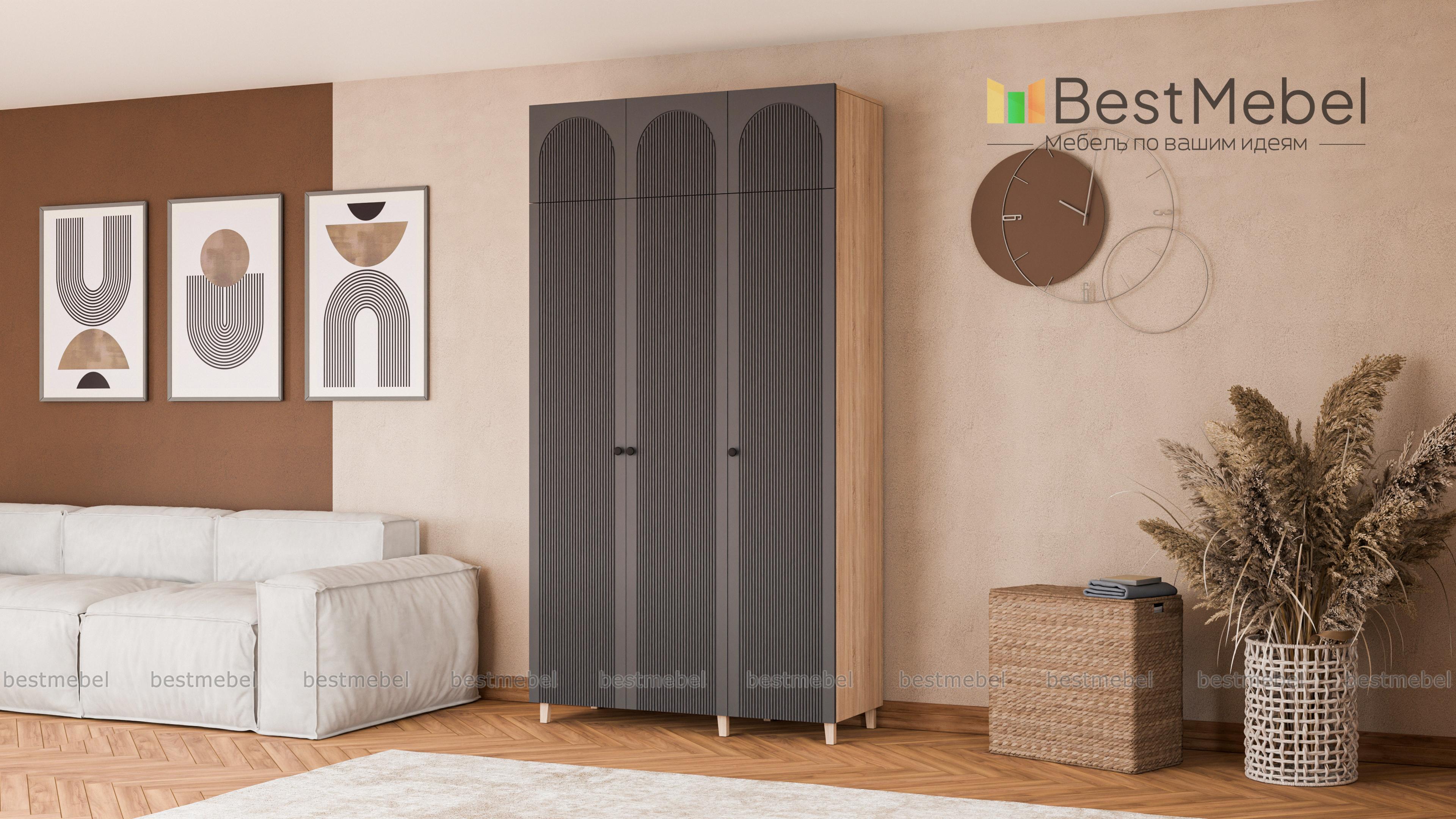 Шкаф распашной Рене 25 BMS сделает хранение в спальне, детской или прихожей удобным и эстетичным. Все предметы гардероба и постельные принадлежности будут скрыты за изящным фасадом с арочными вырезами и рельефом. Корпус и фасад выполнены из ламинированной ДСП и МДФ светлого оттенка, а дополнительную легкость высокому трехдверному шкафу с антресолью придают деревянные ножки. Купить шкаф распашной Рене 25 BMS вы всегда сможете в нашем интернет-магазине, по желанию изменив цвет и размеры.
