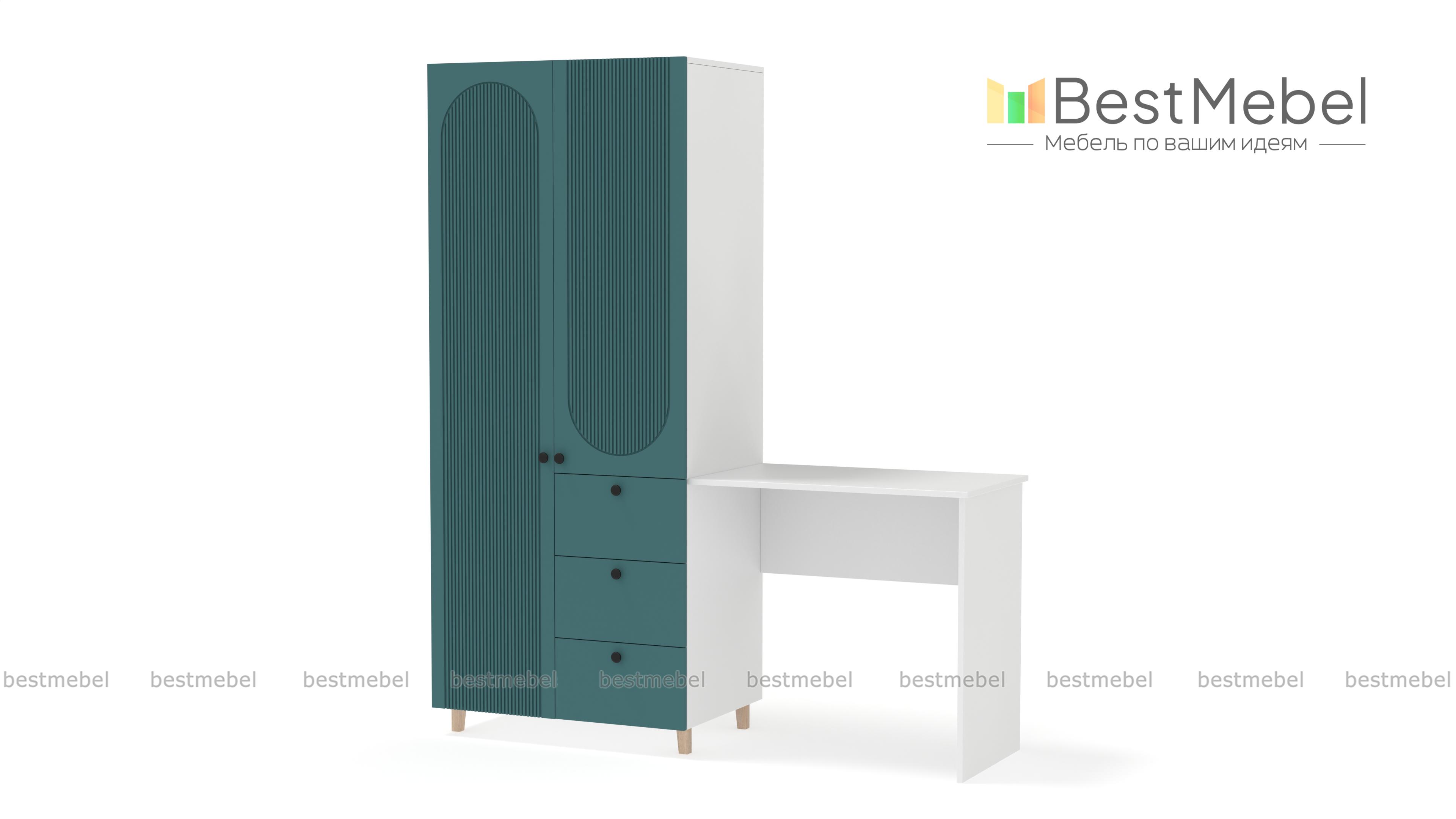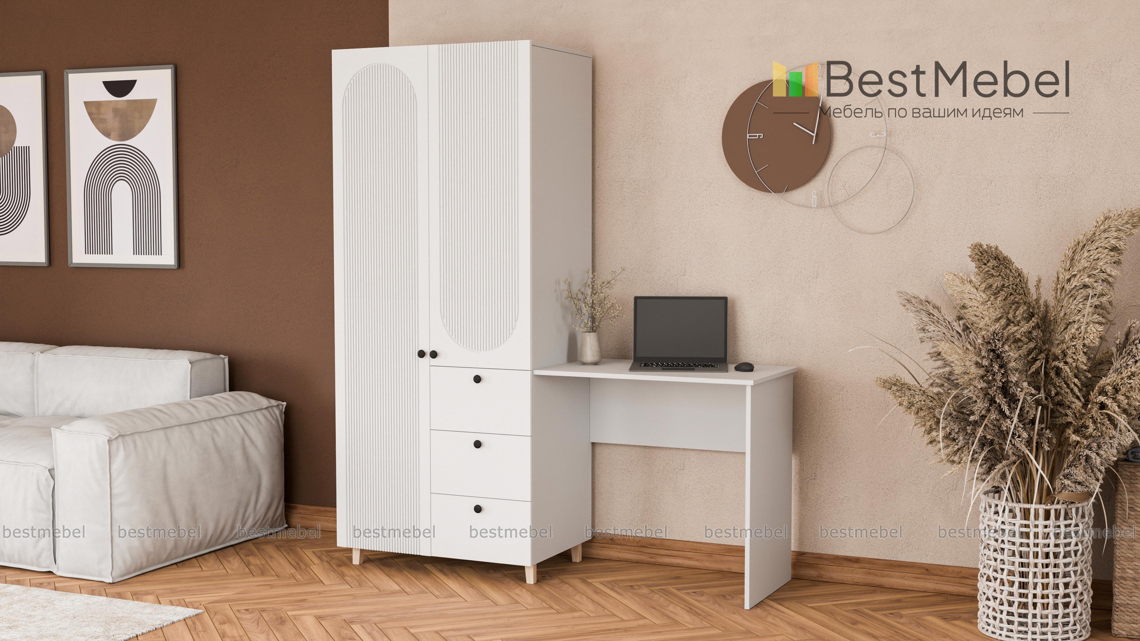 Шкаф со столом Рене 6 BMS объединил рабочую зону и удобную систему хранения. Элегантный гардероб с высокими ножками и фрезеровкой дополнен прямоугольным письменным столом справа. Для хранения вещей предусмотрены распашное отделение и ящики, а размеры столешницы позволяют разместить ноутбук, письменные принадлежности, материалы для творчества. Купить шкаф со столом Рене 6 BMS вы сможете в нашем интернет-магазине, подобрав размеры и наиболее подходящую цветовую гамму.