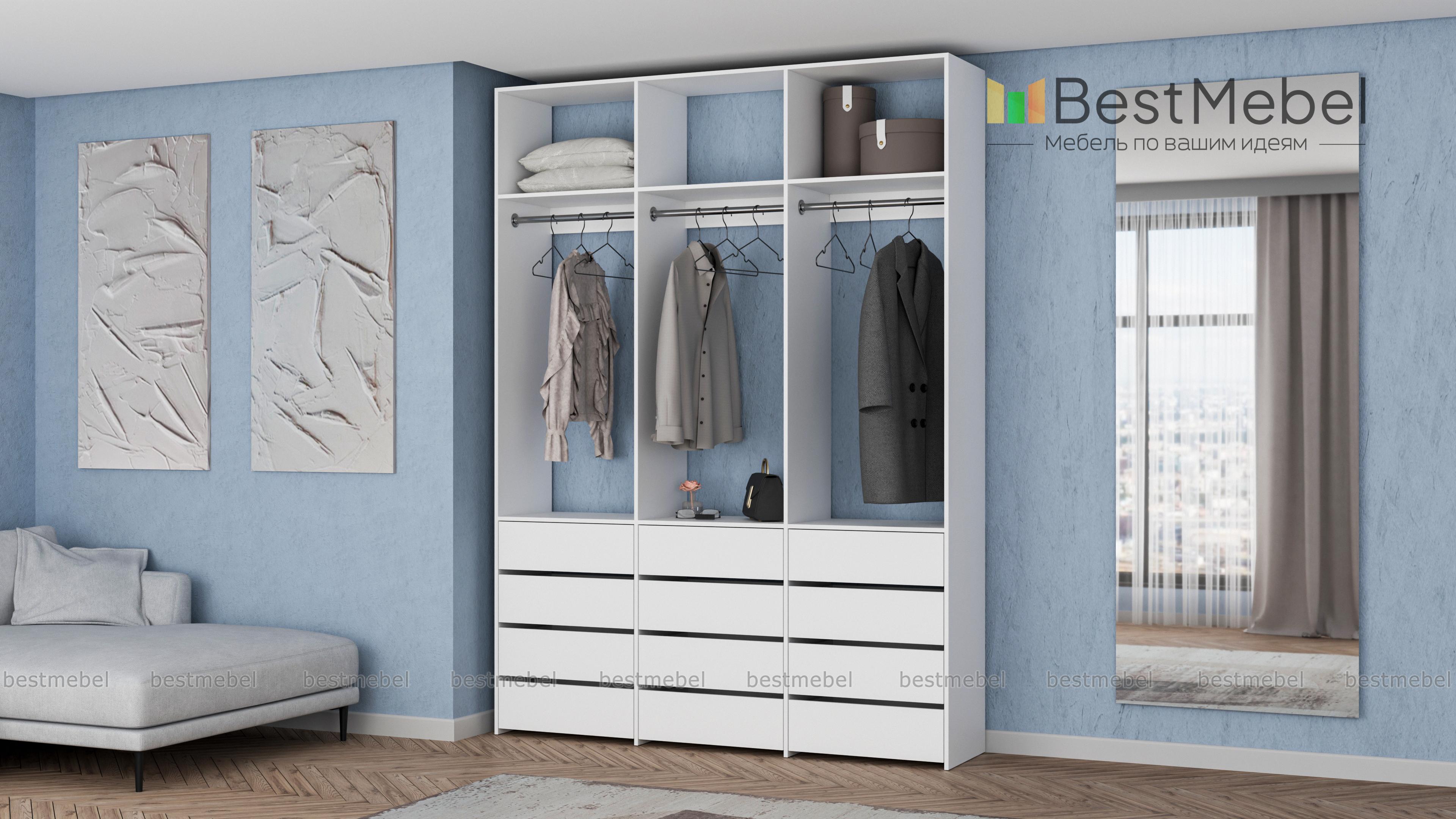 Стеллаж для одежды Мирта 47 BMS выполнен из прочной ламинированной ДСП и включает в себя три секции. В нижней части располагаются выдвижные ящики для текстиля и аксессуаров, средняя занята платяными штангами, а верхняя — полками для несезонных вещей. Минималистичный дизайн позволяет стеллажу легко вписаться в существующий интерьер. Купить стеллаж для одежды Мирта 47 BMS, изготовленный по индивидуальным размерам, вы сможете в нашем интернет-магазине.