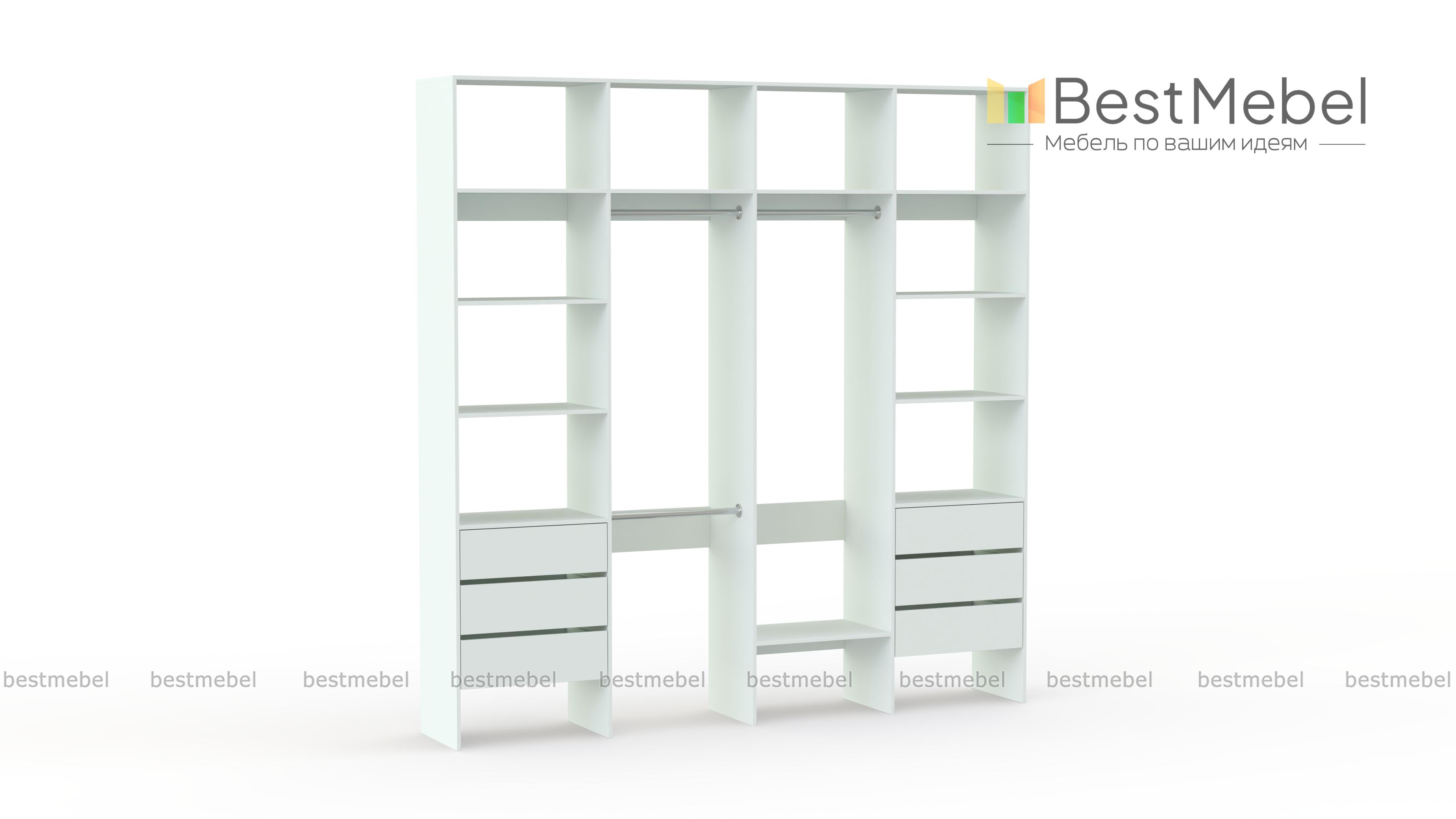 Стеллаж для одежды Мирта 65 BMS поможет легко сохранить порядок в гардеробной и входной зоне. Для компактного и аккуратного размещения вещей в стеллаже предусмотрены штанги, расположенные на двух уровнях, боковые и верхние полки, а также два ряда выдвижных ящиков. Качественная ламинированная ДСП гарантирует простоту ухода и долгий срок службы. Купить стеллаж для одежды Мирта 65 BMS, изготовленный по индивидуальным размерам, можно на сайте нашего интернет-магазина.