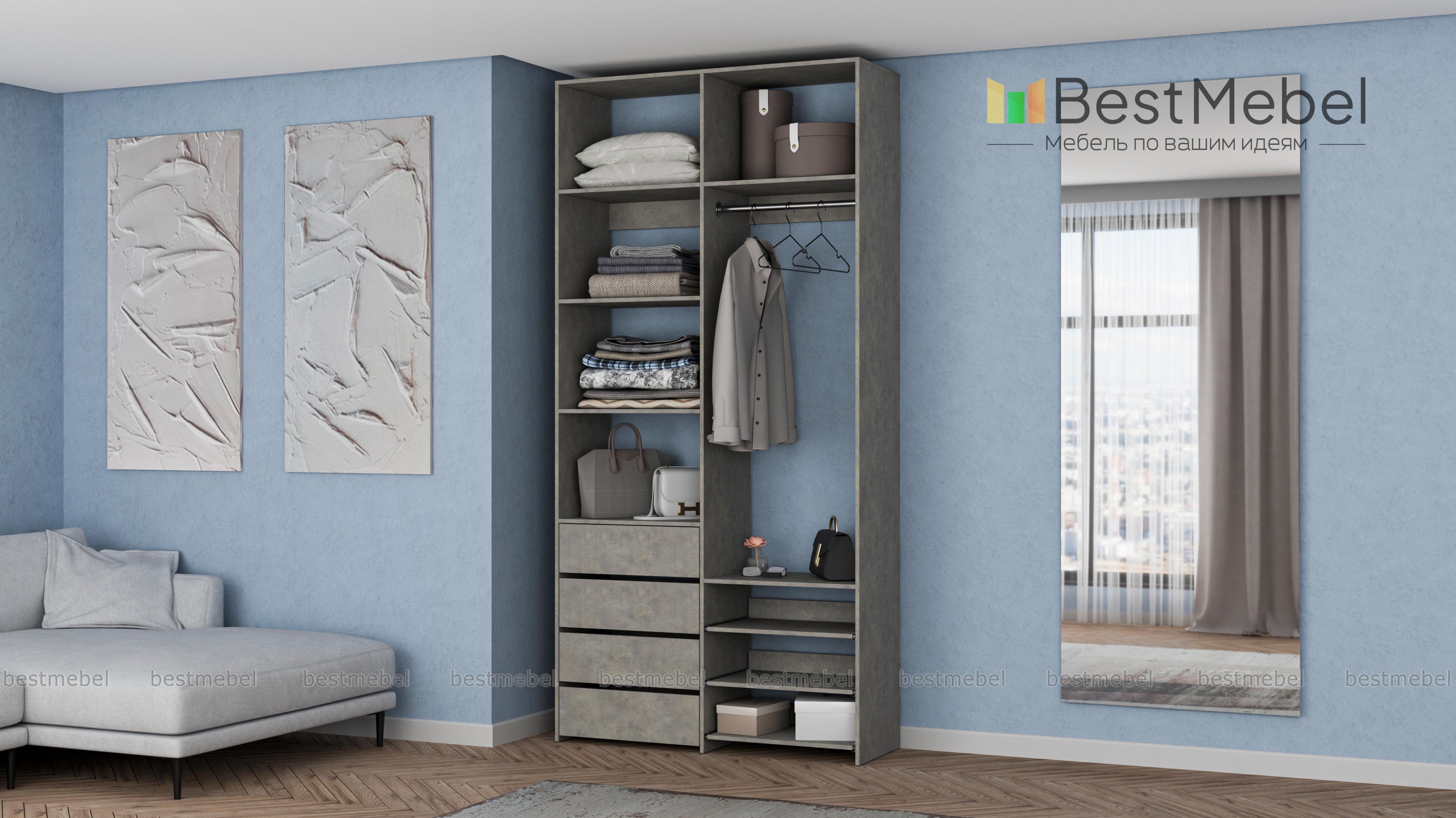 Стеллаж для одежды Мирта 87 BMS оптимален для небольших пространств. Штанга, выдвижные полки и ящики, а также пять просторных бельевых секций обеспечивают достаточно места для хранения базового гардероба. Простой и функциональный дизайн в сочетании с широкой цветовой гаммой позволяют легко комбинировать стеллаж с другой мебелью. Купить стеллаж для одежды Мирта 87 BMS с изготовлением по индивидуальным размерам вы сможете недорого в нашем интернет-магазине.