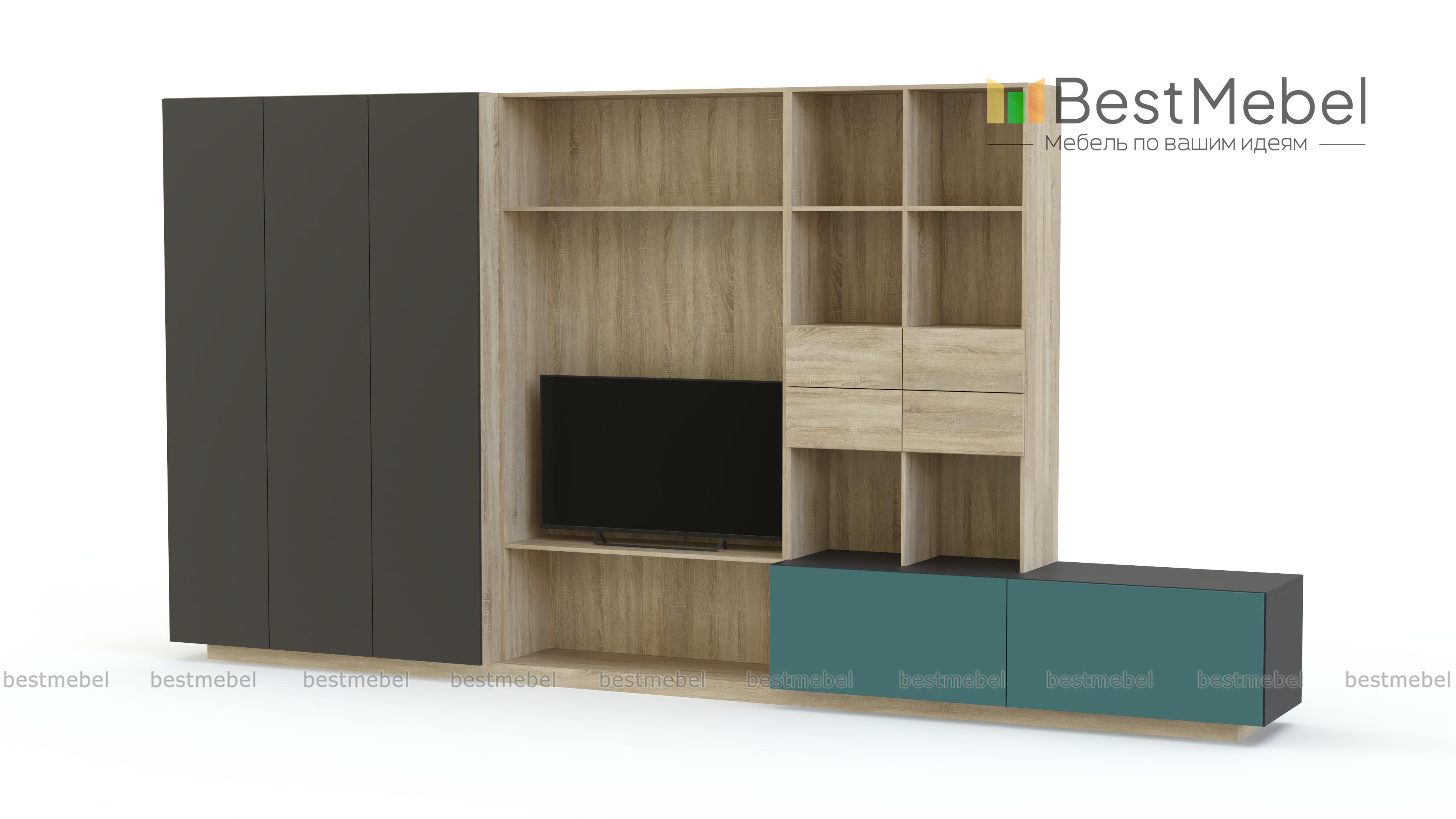 Стенка в гостиную Модерн 33 BMS эффектно сочетает в оформлении древесные тона и белый с ярким цветным акцентом. Крупногабаритная модель станет практичным дополнением и элементом дизайна гостиной в стиле минимализм. Оборудованная секцией под ТВ, выдвижными ящиками, глухими и открытыми полками для книг, домашнего текстиля и бытовых мелочей, стенка дополнена широкой тумбой, на которой смогут разместиться предметы декора. Купить стенку в гостиную Модерн 33 BMS приглашаем к нам в интернет-магазин по лучшей цене.
