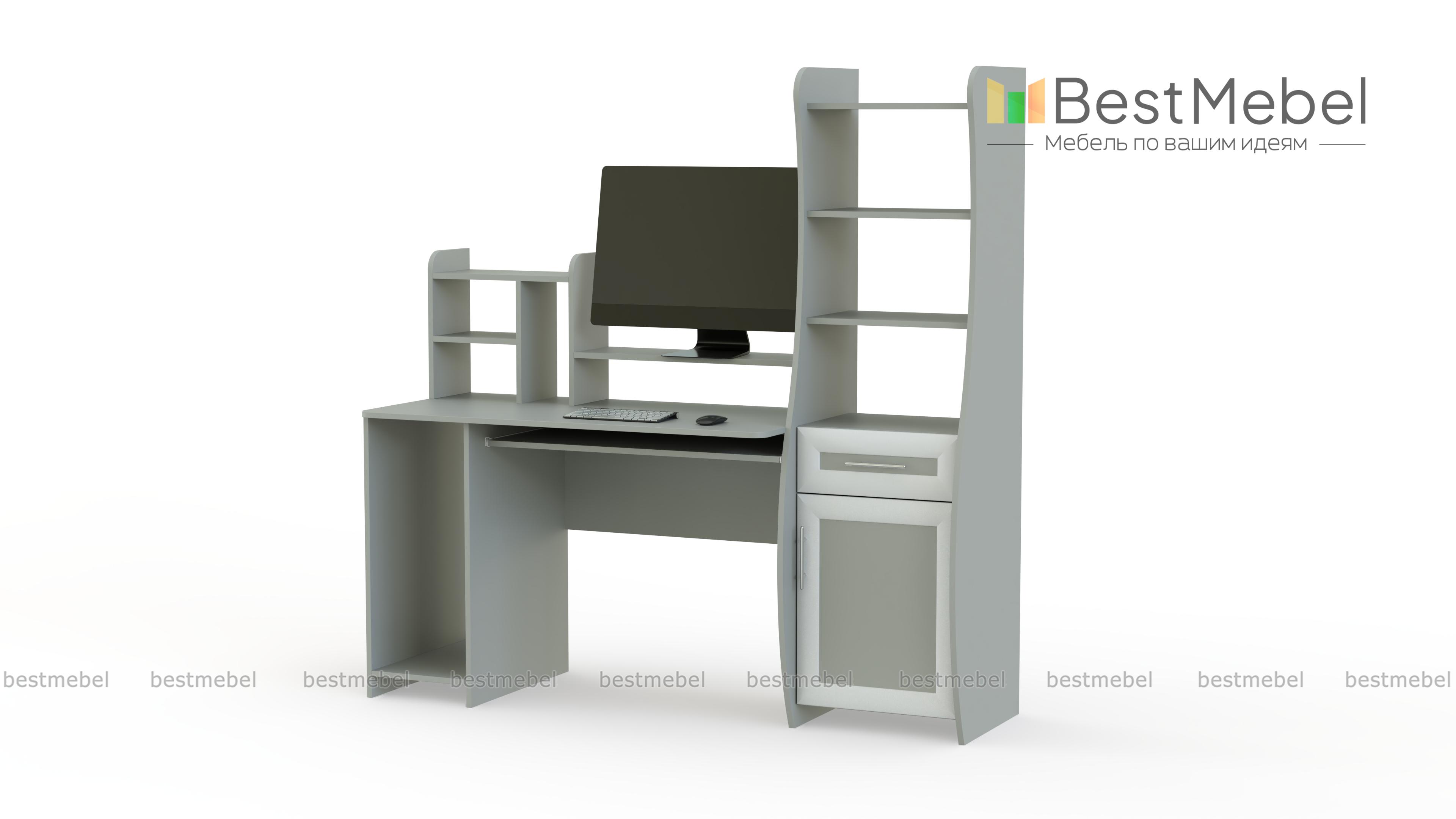 Эта модель привлекает особое внимание необычной формой боковой тумбы. Ее изогнутая форма придает мебели особый стиль и современный вид. Компьютерный стол Магнат имеет специальное место под системный блок, полку для монитора и выдвижную полочку для клавиатуры. Сбоку находится небольшая полочка мелочей и колонок, а просторная боковая тумба даст возможность разместить все необходимые бумаги, книги, канцелярские принадлежности и т.п. Заказать такую мебель Вы можете для дома или офиса.