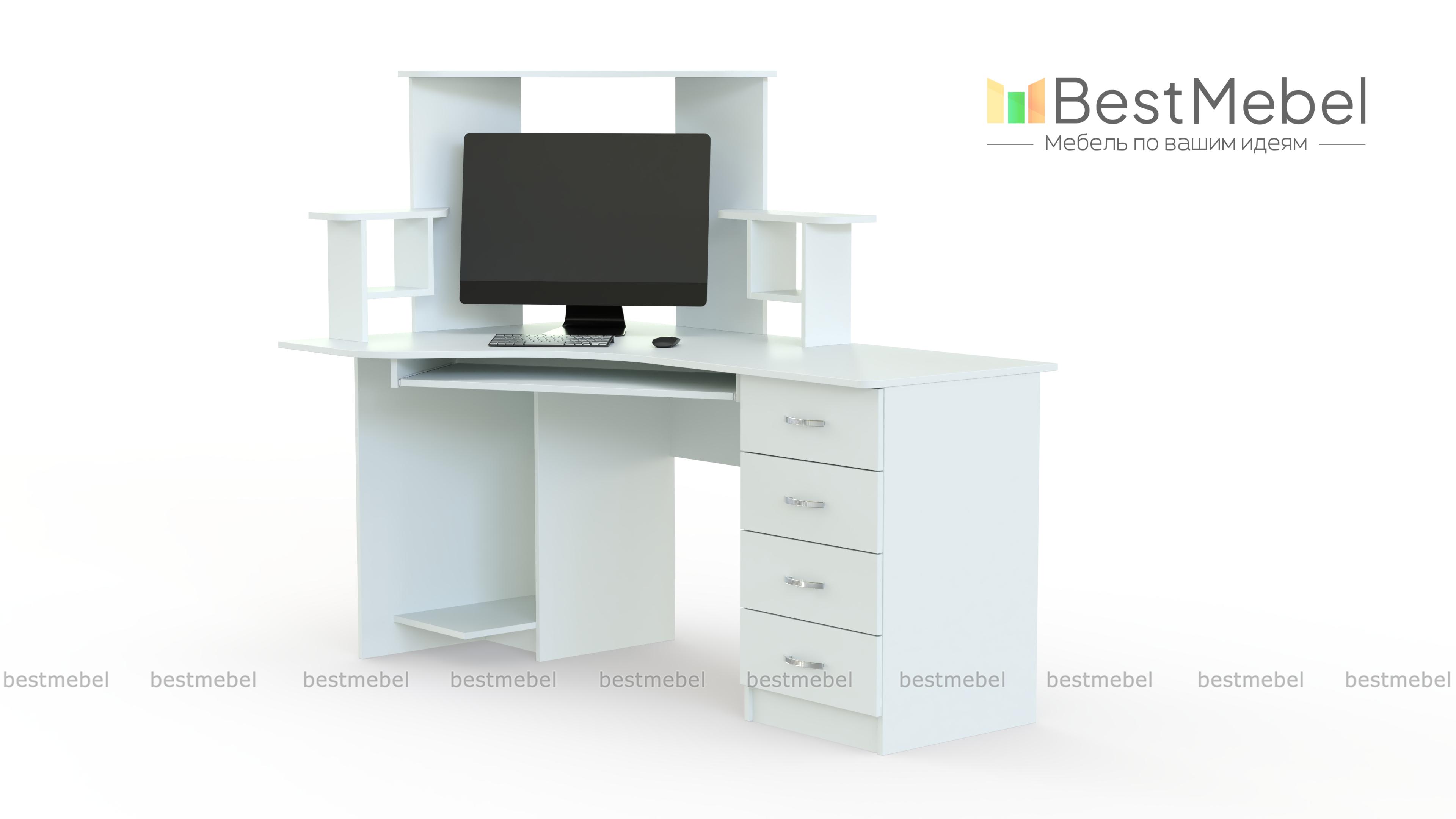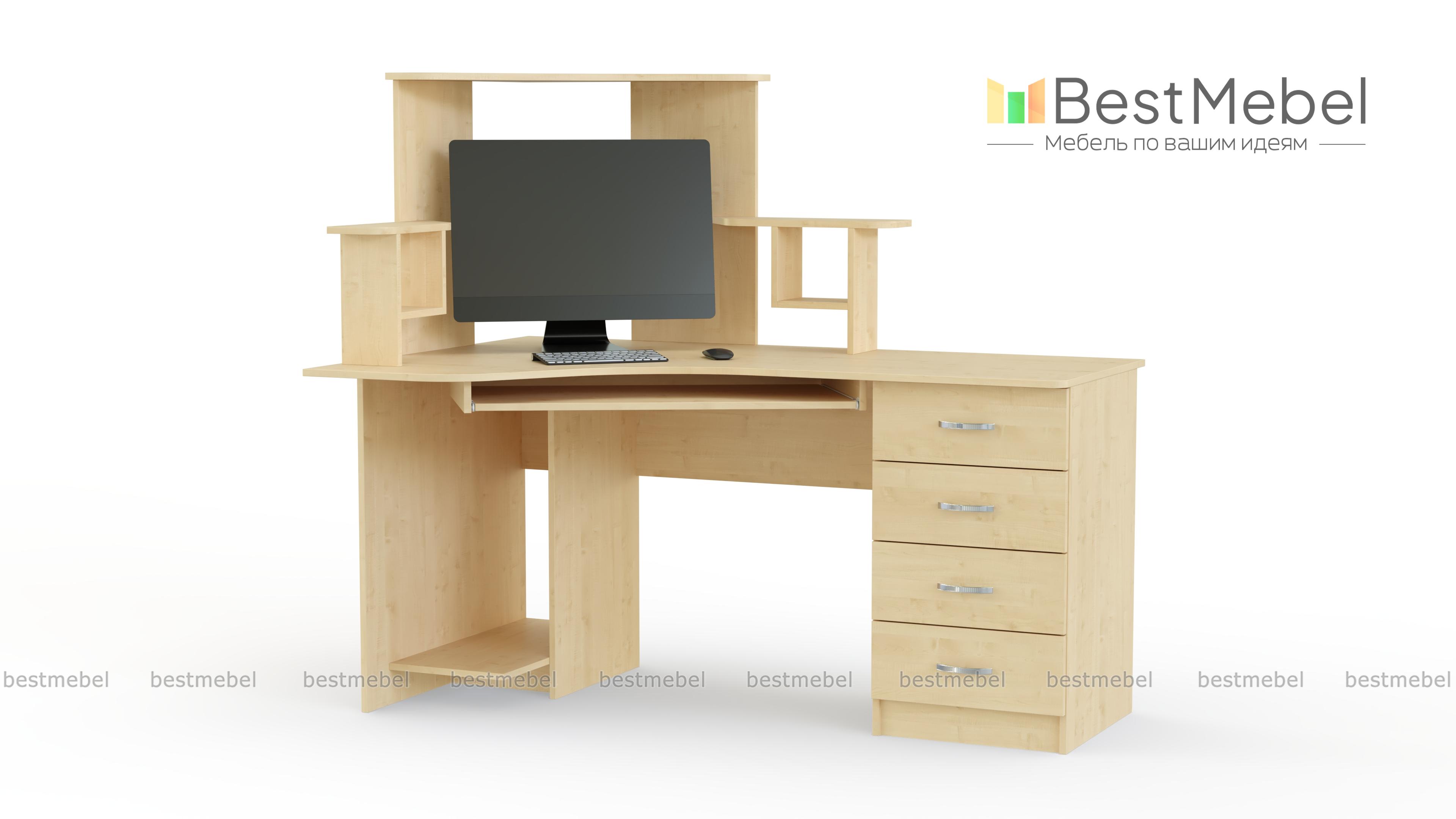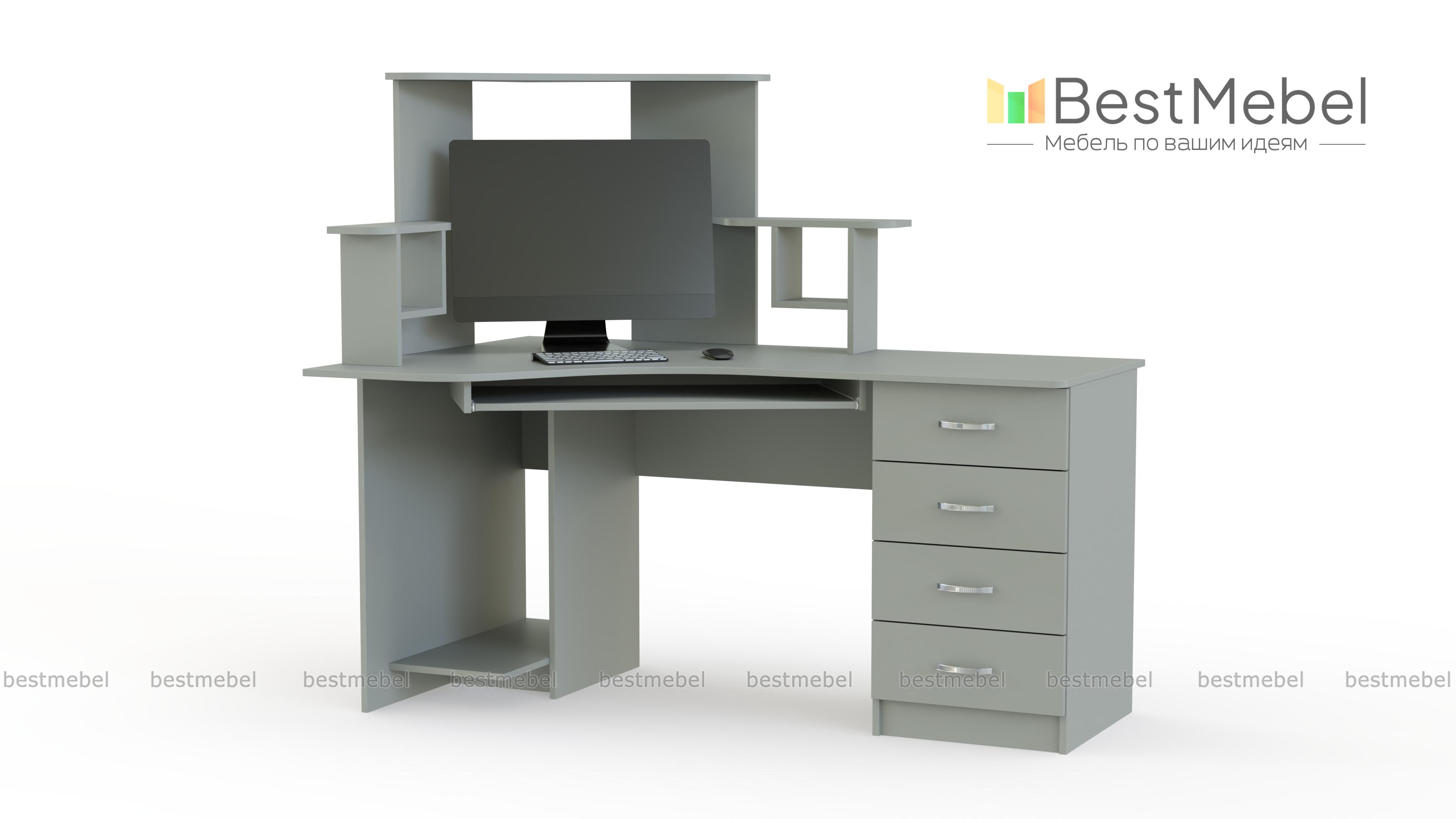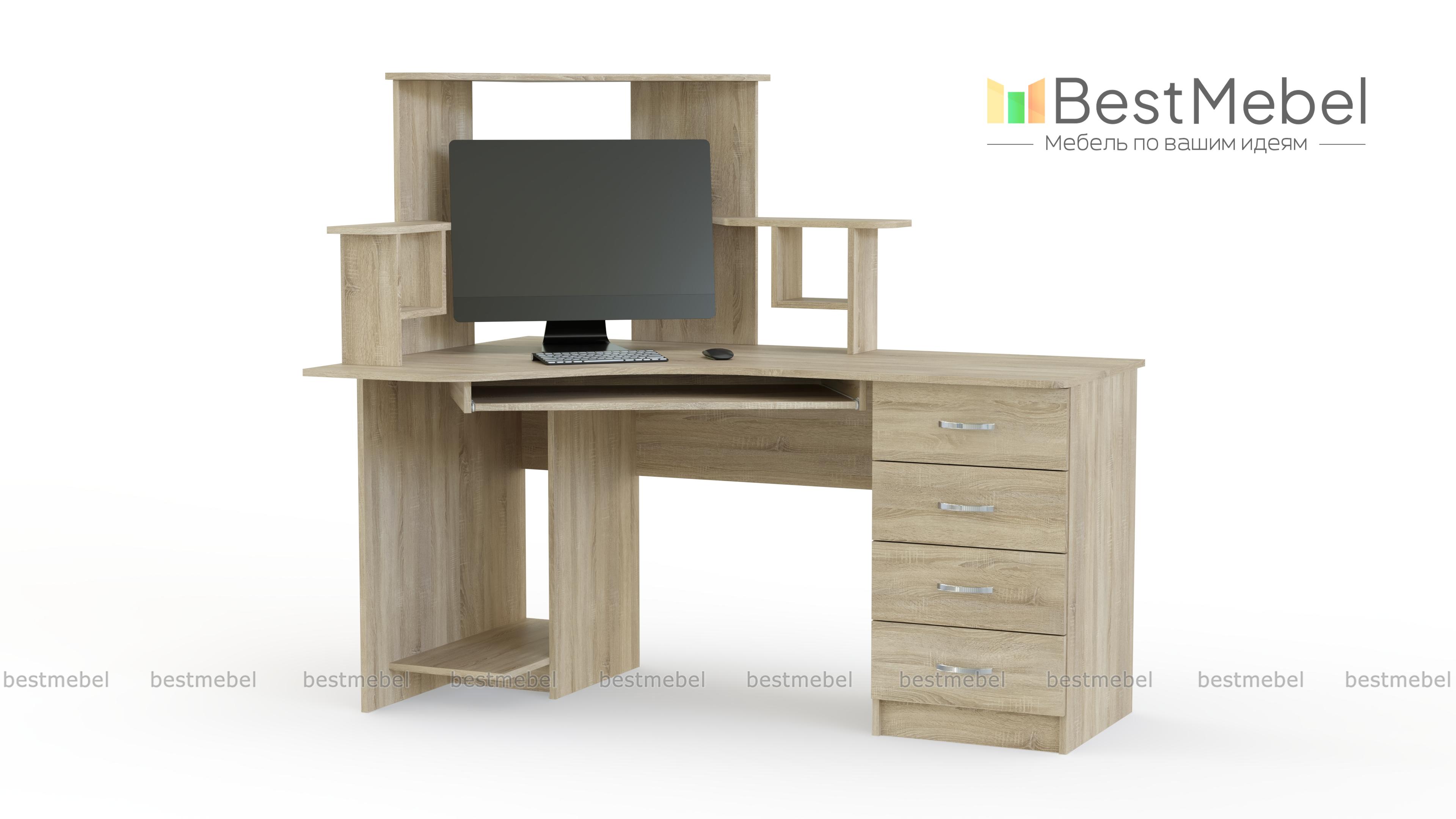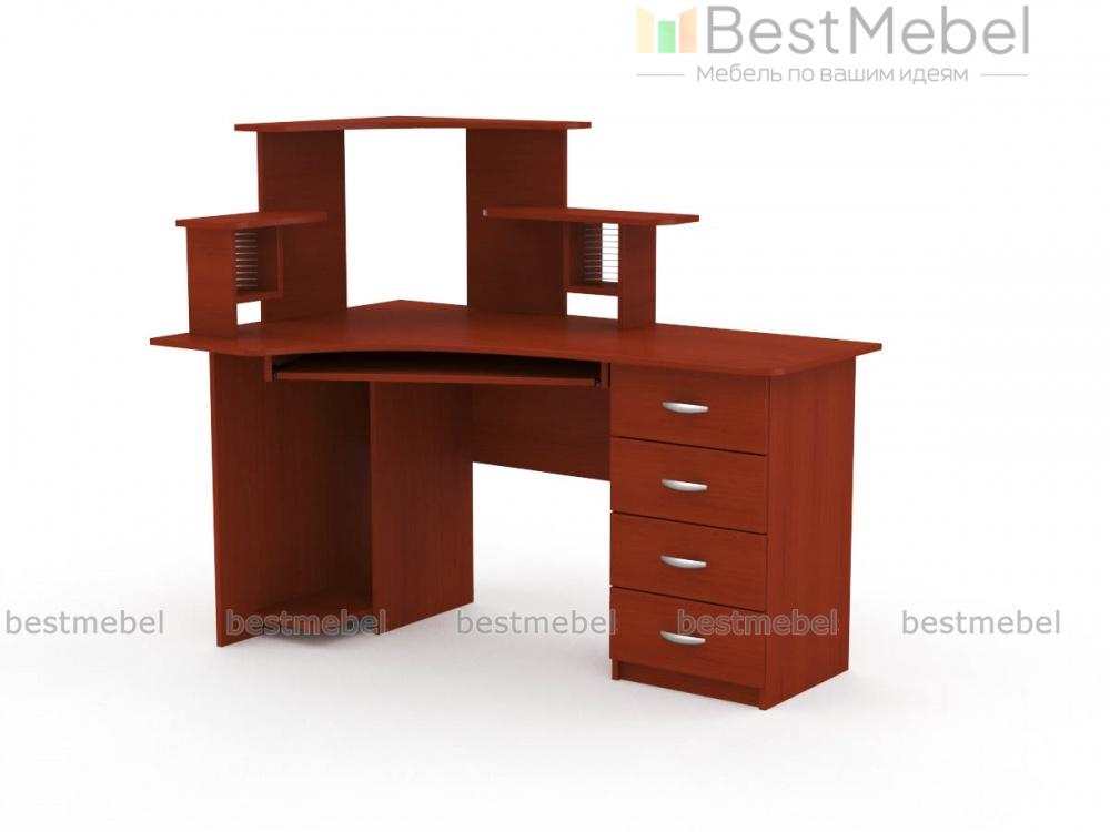 Угловой стол компьютерный СКУ-5 станет отличным решением для комнаты небольших габаритов. Большое количество полок позволяет разложить необходимые Вам диски, а также журналы, книги или канцелярские мелочи. Наличие нескольких выдвижных ящиков позволяет хранить Ваши необходимые документы. На широкую столешницу можно установить монитор с любой диагональю, а системный блок помещается на специальную полку снизу. Купить такой стол Вы можете недорого в нашем интернет-магазине.