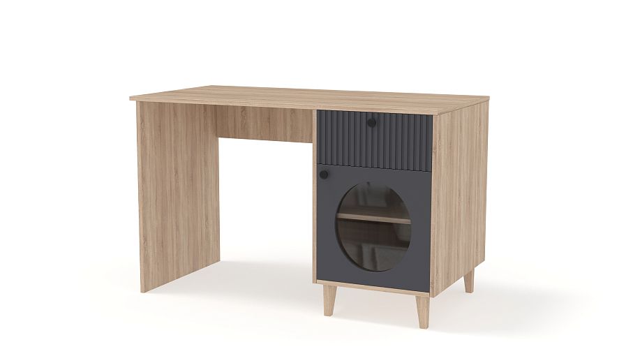 Стол письменный Брукс 2 BMS — функциональный и очень стильный с геометрическим декором и фрезеровкой. Все канцелярские мелочи под рукой в выдвижном ящике справа, а бумаги на виду в распашном отделении со стеклом. Просторная рабочая поверхность стола выполнена из прочной и устойчивой к появлению царапин ламинированной ДСП в природном древесном оттенке. Купить стол письменный Брукс 2 BMS, изготовленный по вашим размерам, приглашаем к нам в интернет-магазин.