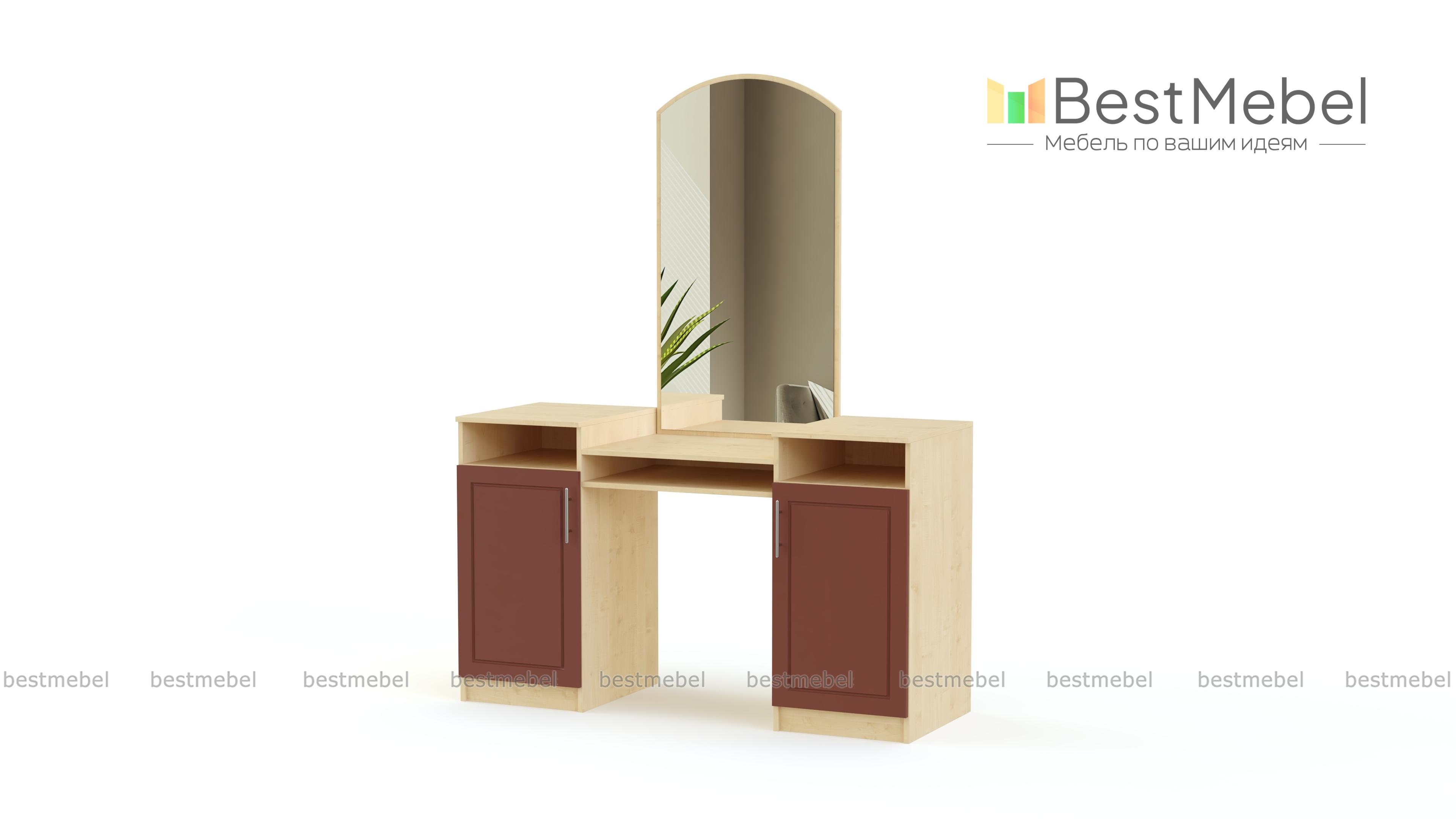 Отличное дополнение к спальному гарнитуру, которое создано красивым, для того чтобы Вы сами смогли стать немного красивее. Купить стол туалетный Джорджия СБ-1144 BMS стоит в спальню любого размера, для того чтобы иметь личное пространство для косметических процедур. В этом поможет великолепное просторное зеркало, которое располагается в центральной части над эргономичной столешницей. По бокам располагается пара шкафчиков с закрытыми полками. Распашные дверцы оборудованы привлекательными ручками, над дверцами располагаются открытые полки.
