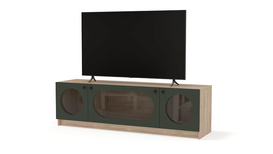 Тумба под ТВ Руди 8 BMS с витриной впишется в интерьеры современного дизайна. Её стильная особенность — контрастные дверцы из МДФ с округлыми вырезами и стеклом. Разделенная перегородками на три секции — одну большую в центре и две малые по бокам, широкая тумба обеспечит место для аудио- и видеоаппаратуры, любимых безделушек, журналов и книг. Купить тумбу под ТВ Руди 8 BMS, изготовленную по индивидуальным размерам, вы всегда сможете на сайте нашего интернет-магазина.